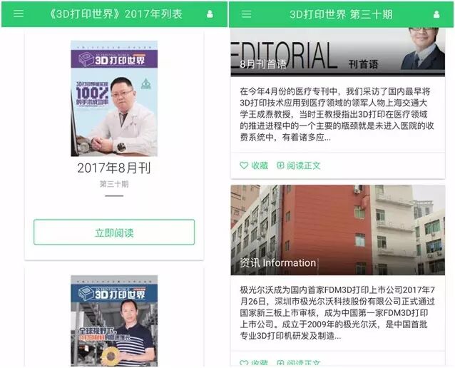 《3D打印世界》杂志创立至今已有3年,坚持以月刊形式为3D打印从业者及广大爱好者提供全方位资讯内容。杂志联手全球权威专家倾力打造,内容涵盖环球资讯、深度观察、权威解读、名人名企、创客等特色栏目,获得业内人士高度认可。自面世以来,深受广大3D打印专业人士喜爱,每月阅读量突破15万。为适应移动阅读时代,特推出杂志移动端,不用下载APP,不占手机内存,精品文章随时看。除掌上阅读外,还具有收藏文章、转发给好友等一系列有趣的交互功能,广大读者可按个人爱好选取文章收藏,也可以将文章通过微信、微博共享给好友。